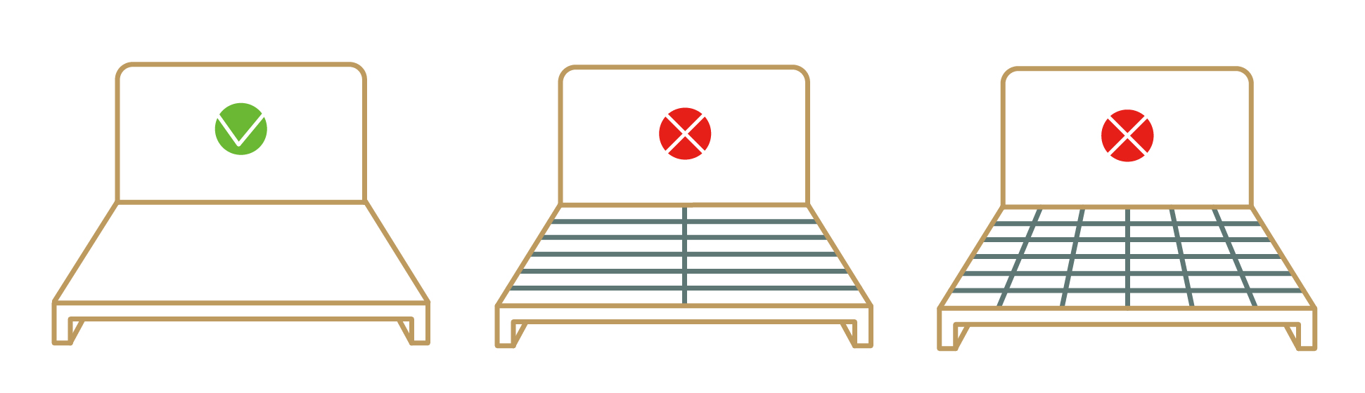 用料紮實的床墊都較不建議使用排骨床架或是網狀架,因為其中間的空隙可能會導致床墊受力不均勻,而破壞床體結構的情形發生,使用時也會因為床底的支撐性不足而影響舒適度。